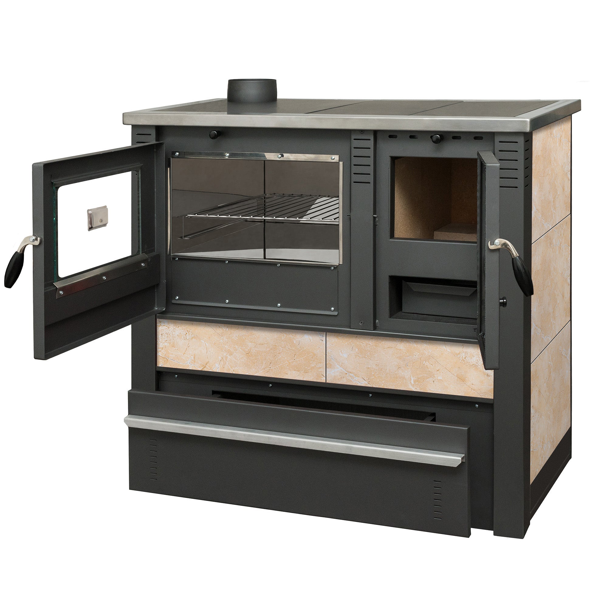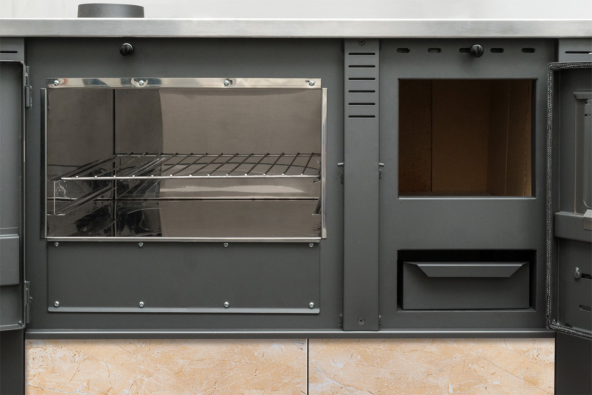 Multifunktional: Heizen, Kochen und Backen in einem Gerät – dank 3 separater Kammern (Feuerraum, Ofen, Kochplatte).