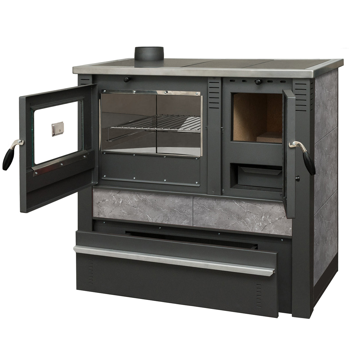 Multifunktional: Heizen, Kochen und Backen in einem Gerät – dank 3 separater Kammern (Feuerraum, Ofen, Kochplatte).