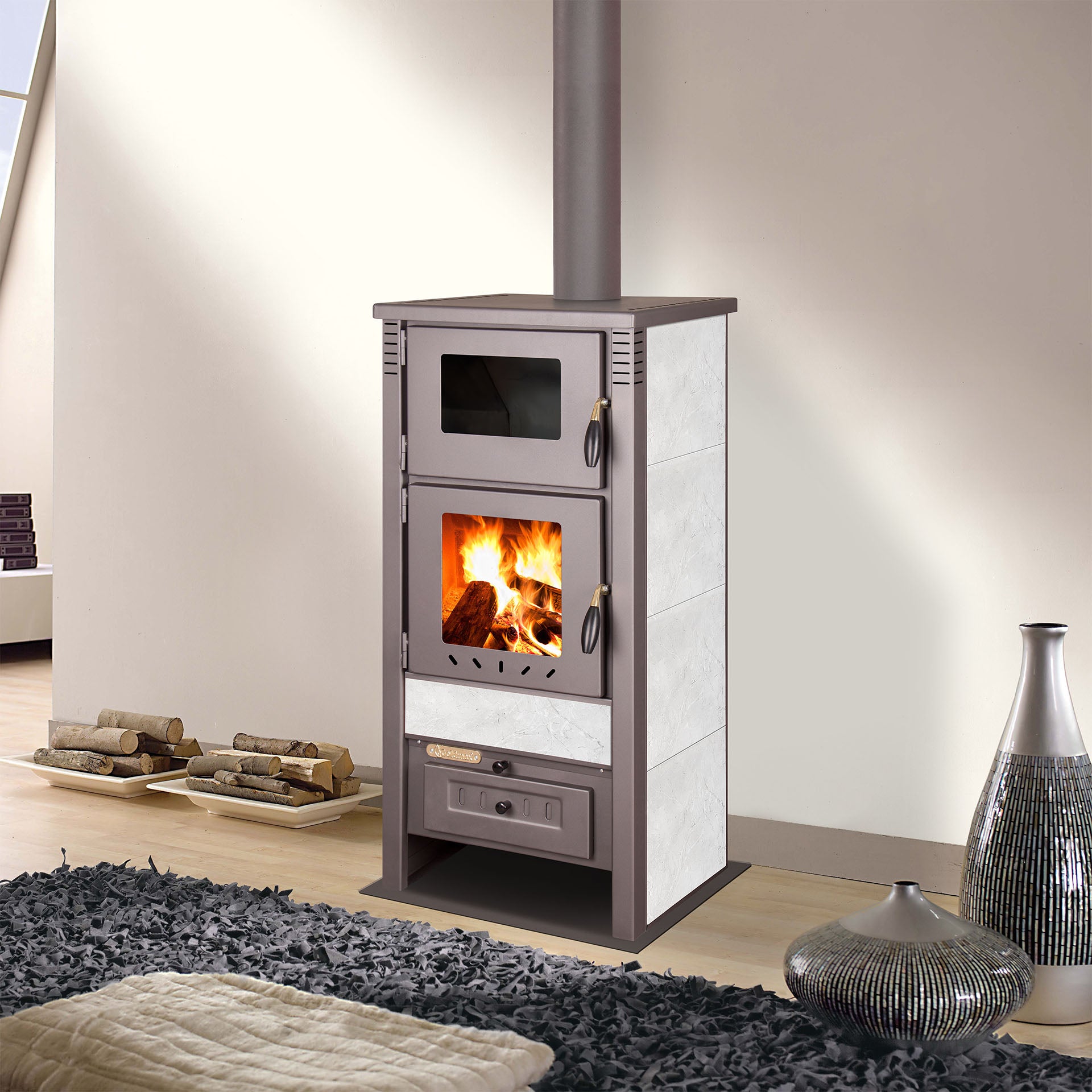 Heizen & Backen in einem Gerät: integriertes Backfach mit Thermometer für echte Holzofen-Ergebnisse